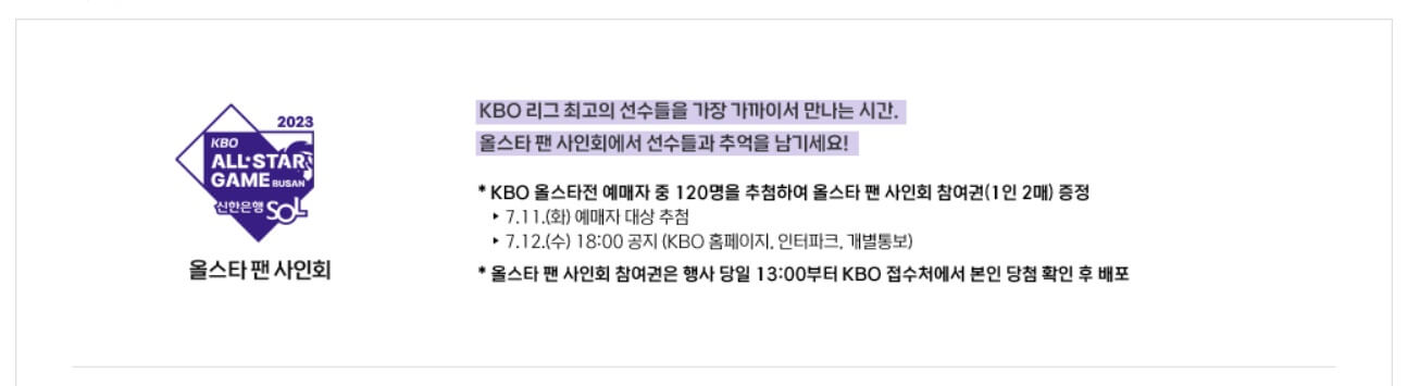 - KBO 올스타 프라이데이 : 2023년 7월 14일 (금) 14:00 매표소 오픈